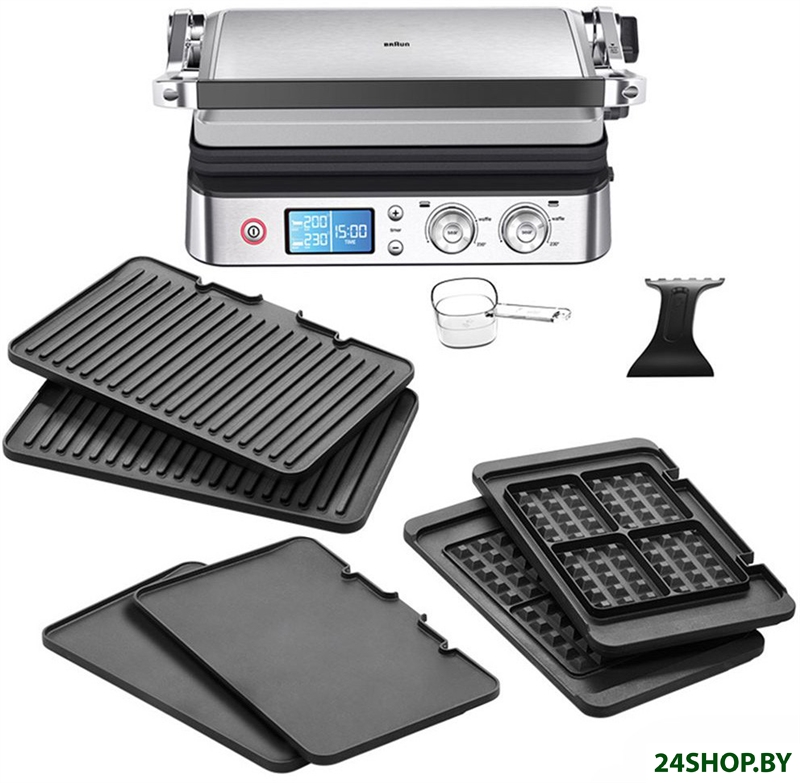 - Комплектация: Электрогриль со съемными нагревательными пластинами: гладкая, ребристая, вафельницаМерная чашечкаЛопатка