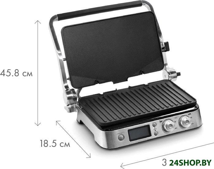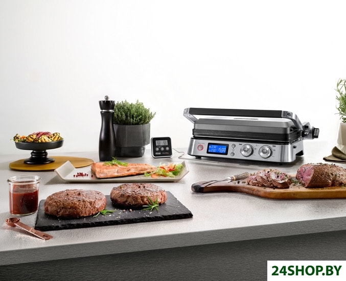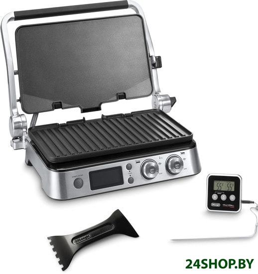 - Комплектация: • 1 плоская пластина• 1 рифленая пластина• термощуп• поддон для сбора жира• лопатка-скребок для чистки