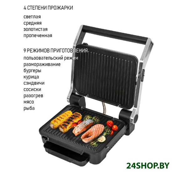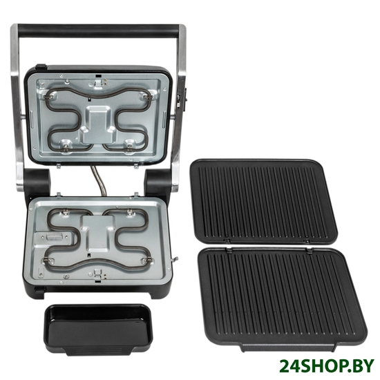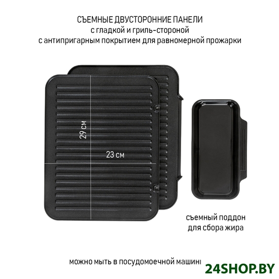 - Комплектация: электрогриль, съемные панели (2 шт.), съемный поддон для сбора жира, гарантийный талон, инструкция на русском языке