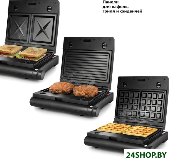 - Комплектация: ГрильСменные панели:- для гриля (установлены в устройство) - 2 шт- для сэндвичей - 2 шт- для вафель - 2 штРуководство по эксплуатации