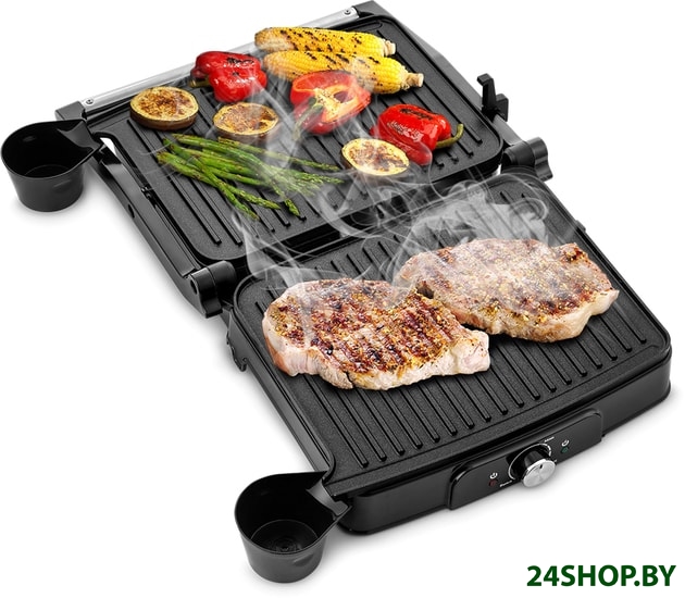 Бесконтактный электрогриль по принципу приготовления ближе к классическому грилю на углях: порции продуктов располагаются на металлической решетке, нагревательный элемент помещен под решетку, стекающий жир собирается в поддон. Контактный односторонний гриль представляет собой нагревательную пластину, рифленую или плоскую. Единственное его отличие от обычной сковороды - стекание жира в поддон. Двухсторонний контактный гриль, или гриль-пресс, представляет собой две шарнирно соединенные нагревательные пластины. Это наиболее дорогой и при этом наиболее удобный вид грилей.