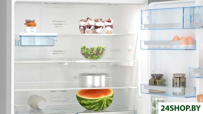 - Дополнительная комплектация: выдвижная полка, подвесной контейнер, подставка-лоток для бутылок, лоток для яиц