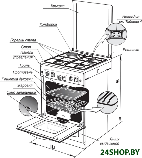 - Газовые конфорки: 4