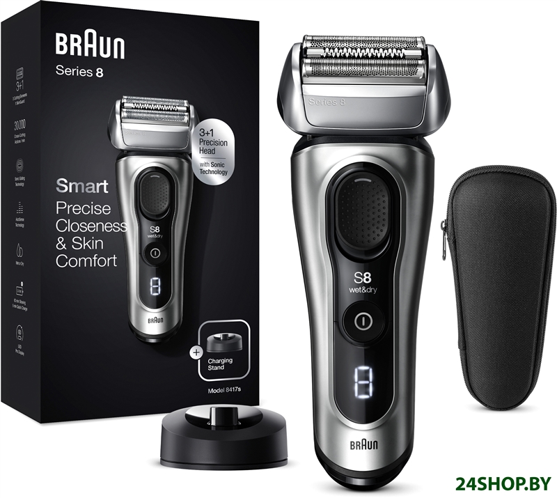- Комплект поставки: Бритва Series 8 Твердый тканевый футляр для электробритвы Braun Series 8 Зарядная станция Кабель питания SmartPlug