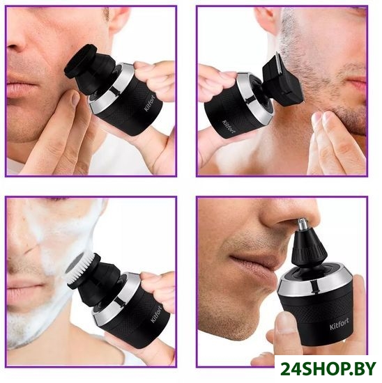 - Дополнительные насадки: съемный триммер, триммер для носа и ушей, насадка-триммер для длинной щетины, насадка-массажер
