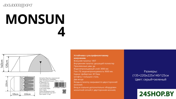 - Водостойкость тента: 3 000 мм вод. ст.