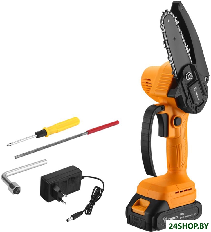 - Комплект поставки: - Пила (шина и цепь в комплекте);- Зарядное устройство;- Аккумулятор 2,0 Ач - 1 шт;- Отвертка;- Напильник;- Гаечный ключ;- Инструкция;- Коробка.