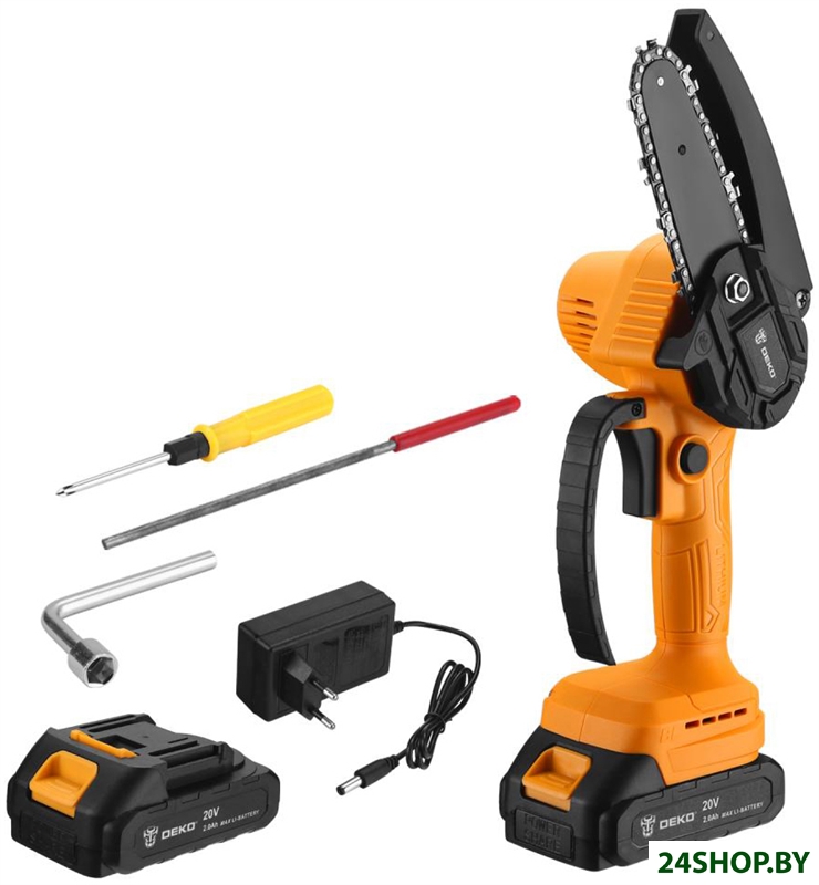 - Комплект поставки: - Пила (шина и цепь в комплекте);- Зарядное устройство;- Аккумулятор 2,0 Ач - 2 шт;- Отвертка;- Напильник;- Гаечный ключ;- Инструкция;- Коробка.
