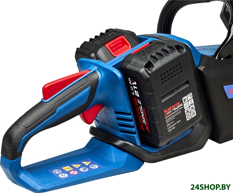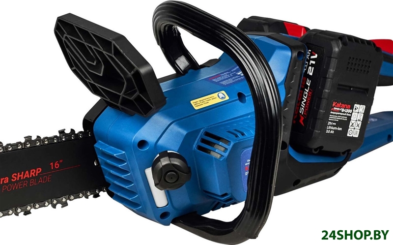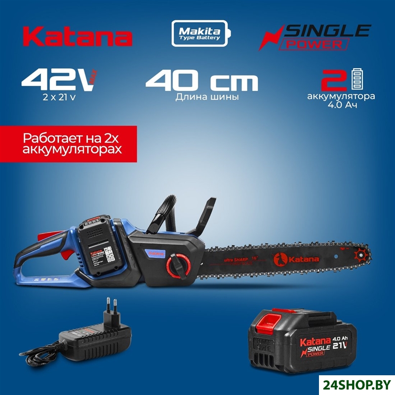 - Комплект поставки: - Пила цепная аккумуляторная Katana - 1 шт. - Инструкция по эксплуатации с гарантийным талоном - 1 шт. - Цепь пильная - 1 шт. - Шина цепи - 1 шт. - Защитный чехол - 1 шт. - Зарядное устройство - 1 шт. - Аккумуляторная батарея - 2 шт.