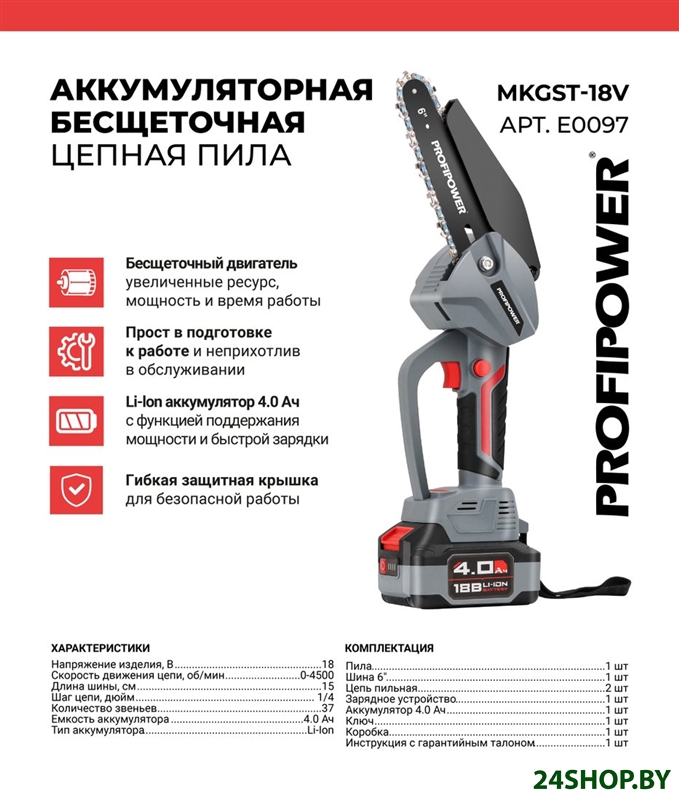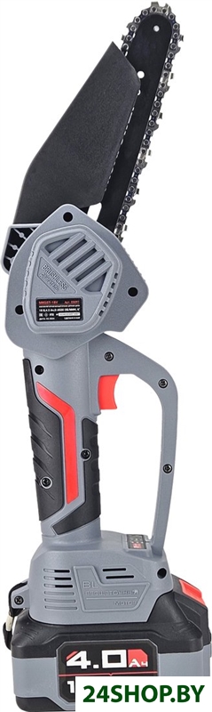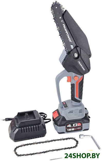 - Комплект поставки: - Пила;- Аккумулятор;- Зарядное устройство;- Шина;- Цепь;- Ключ;- Кейс;- Кожух защитный;- Инструкция с гарантийным талоном.