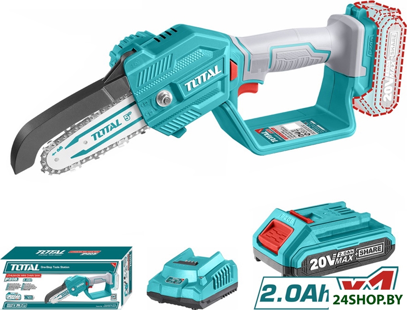 - Комплект поставки: Пила цепная аккумуляторная - 1 шт.Шина - 1 шт.Цепь - 1 шт.Аккумулятор 2,0 Ач - 1 шт.Зарядное устройство - 1 шт.