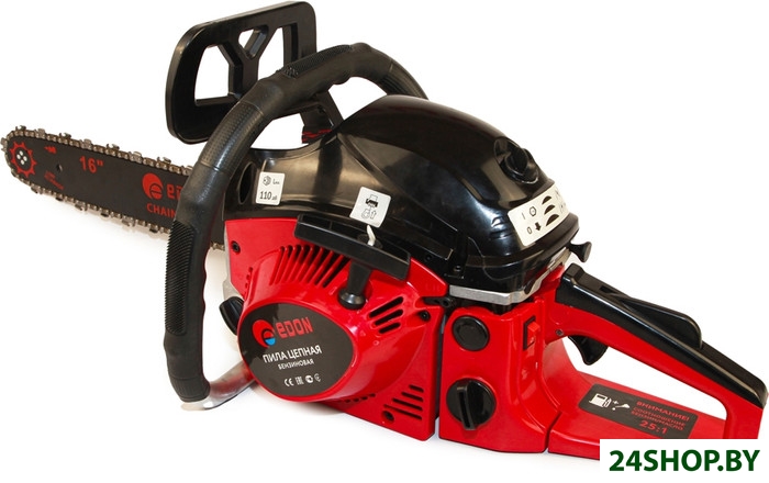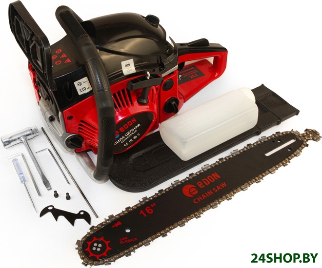 - Комплект поставки: - шина, - цепь, - защитный чехол, - емкость для топлива, - зубчатый упор, - крепеж