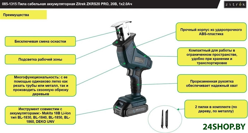 - Комплектация: - сабельная пила.- аккумулятор.- зарядное устройство.- пильное лезвие - 2шт;- руководство по эксплуатации.