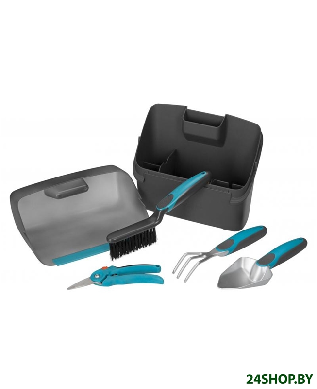 - Комплектация: секатор, лопатка цветочная, мотыжка, щетка, совок, ящик для хранения