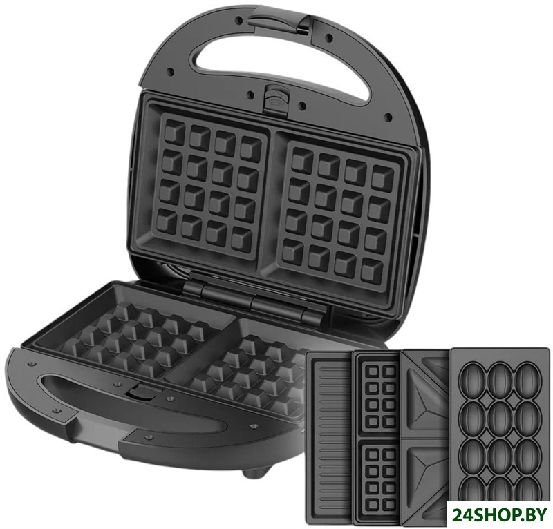 - Рабочая поверхность: гриль-пластина, форма для 2 ломтиков хлеба, вафельница, орешница