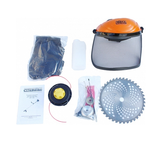 - Аксессуары: - катушка с леской- нож для скашивания- плечевой ремень- инструкция- емкость для смешивания топлива