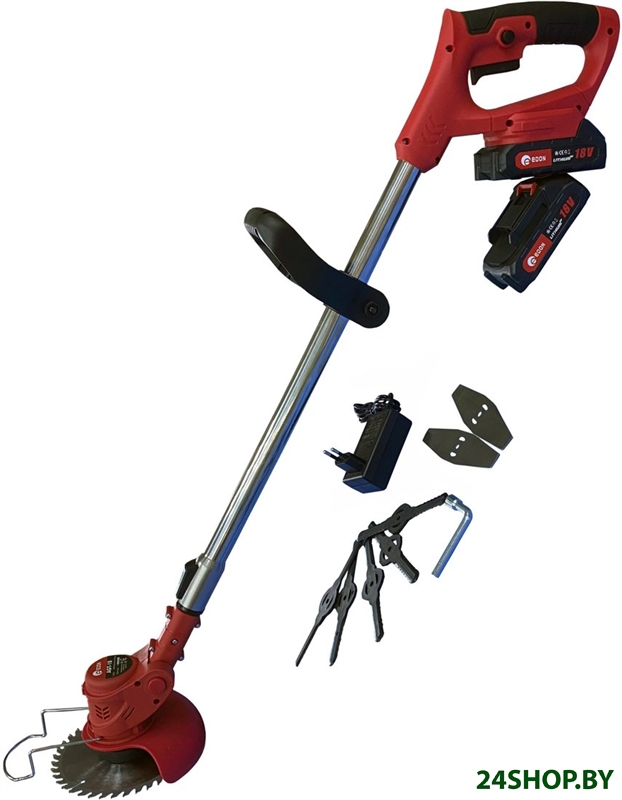 - Аксессуары: Триммер в сборе;Рукоятка;Защитный кожух;Скоба защиты растений;Фиксатор рукоятки;Катушка;Круглый металлический нож, пластиковые сменные лепестки, 2 лепестковых металлических ножа;Li-Ion аккумулятор 18 В, 1,5 А*ч;Зарядное устройство;Набор для сборки и монтажа;Инструкция по эксплуатации