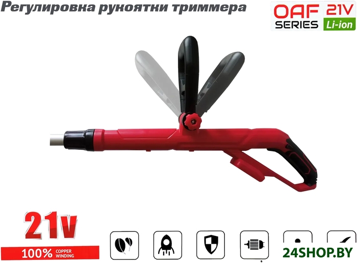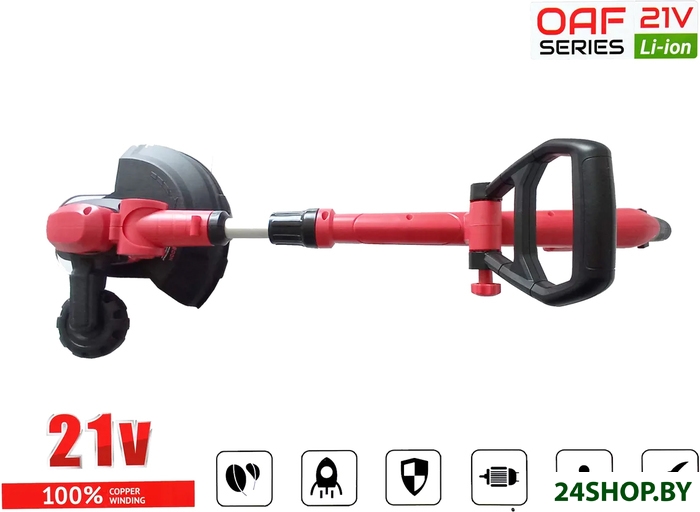 - Аксессуары: - Дополнительная рукоятка;- Направляющее колесо с кронштейном;- Защитный кожух;- Комплект крепежа;- Триммер аккумуляторный;- Катушка с леской;- Руководство.