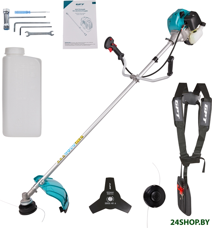 - Комплектация: - Двигатель- Защитный кожух- Набор ключей для сборки и обслуживания- Набор креплений для сборки- Емкость для приготовления топливной смеси- Триммерная катушка- Разгрузочный ремень- Руководство по эксплуатации- 3-лопастной нож
