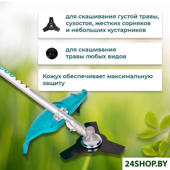 - Режущая оснастка в комплекте: леска, металлический нож