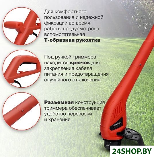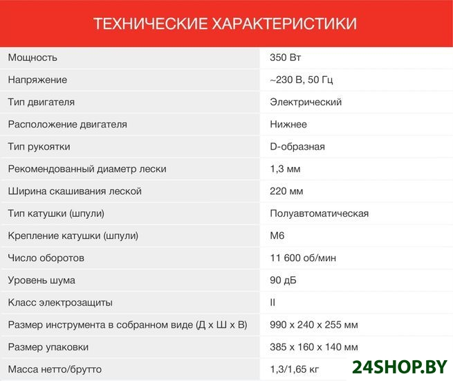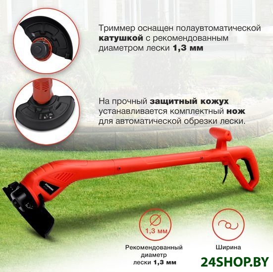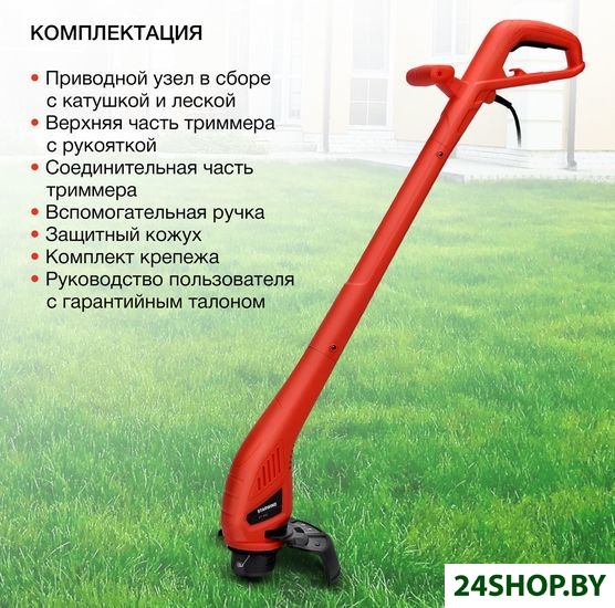 - Комплектация: - Приводной узел в сборе с катушкой и леской- Верхняя часть триммера с рукояткой- Соединительная часть триммера- Вспомогательная ручка- Защитный кожух- Комплект крепежа- Руководство пользователя с гарантийным талоном