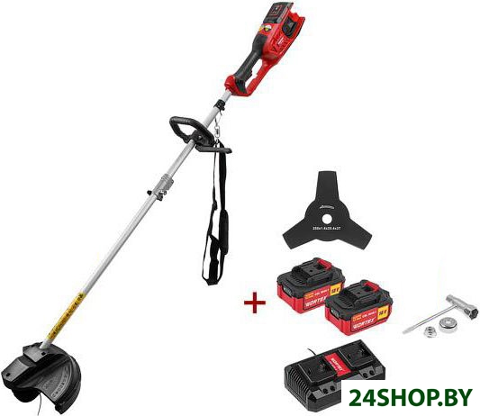 - Комплектация: - Триммер аккумуляторный- Зарядное устройство- 2 аккумулятора- Дополнительная рукоятка- Катушка с леской (установлена)- Нож- Защитный кожух- Барашковый винт- Крестообразная отвертка- Гаечный ключ- Торцовый шестигранный ключ- Монтажный ключ- Плечевой ремень- Емкость для масла- Паспорт