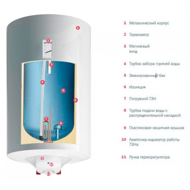 - Принцип нагрева воды: накопительный